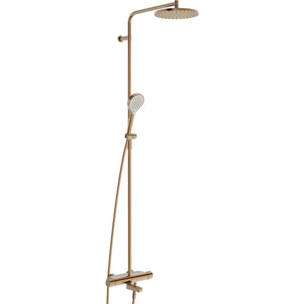 Takduschset i borstad brons med termostatblandare för kar/dusch, anslutning 150cc med G 3/4" invändig gänga, lekande mutter med plantätning. Användarvänliga vred med temperaturbegränsningsknapp 38°, kontroll för Ecoflöde via tryckknapp. Blandaren är utrustad med backventiler och smutsfilter. Handdusch med ecoflöde och 3-stråltyper för en komfortabel duschupplevelse. Takdusch och handdusch är enkla att rengöra tack vare sina antikalk-munstycken. Blandaren har en magnetisk hylla inkluderad för fastsättning i blandarkropp som ger en djupare avställningsyta. 7,2/19,2/13,2L/min @ 3 bar - Eco/kar/dusch flöden.