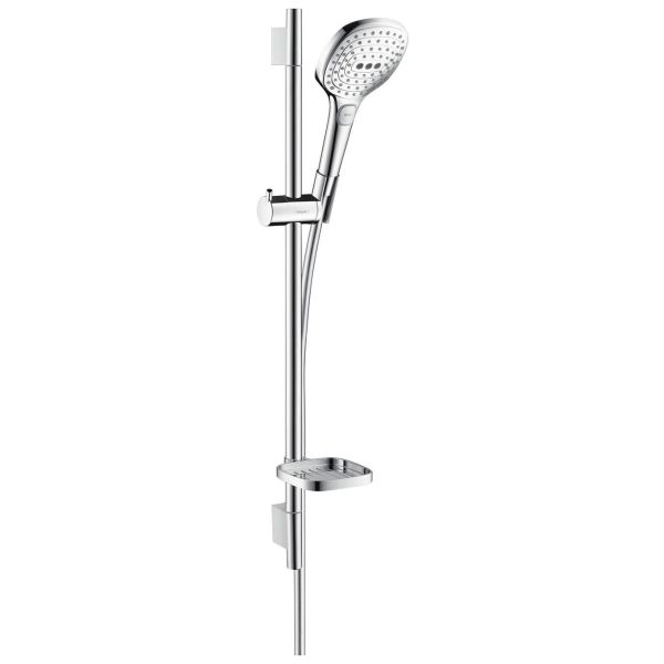 Duschset Raindance Select E120 med 3jet handdusch. Setet består av handdusch, duschstång, duschslang, glidfäste och tvålkopp. Bekväm stråltypsomställning med Select-knapp mellan stråltyperna Rain, RainAir och Whirl.