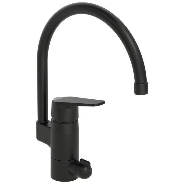 Svart skållningsskyddad köksblandare eco med hög utloppspip och diskmaskinsavstängning, svängbar pip och strålsamlare. Utloppspipens svängradie är förinställd på 120° (kan begränsas till 0° eller 60°). Spaken är utrustad med en eco-knapp för begränsning av flöde. Högre flöde fås genom att trycka in eco-knappen samtidigt som spaken lyfts eller vrids förbi spärrläget. Flöde 0,17 / 0,28 l/s (eco/standard). Begränsning av maxtemperatur möjlig. Med flexibel anslutning. Blandaren är utrustad med 3S installationssystem för snabb och enkel installation. 4MS godkänd mässingslegering.