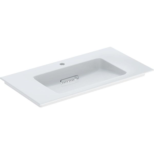 Möbeltvättställ med horisontellt utlopp. B: 90cm, T: 48cm, Kranhål: Utan, Överfyllnad: Utan. Färg: KeraTect/vit , glansig vit