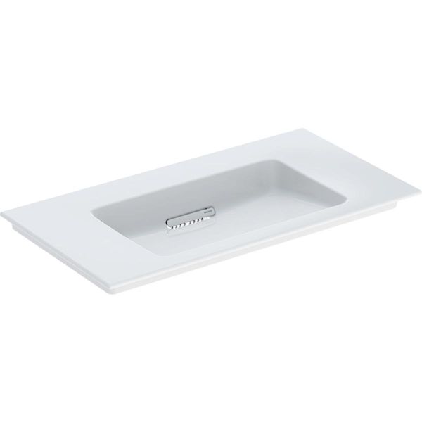 Möbeltvättställ med horisontellt utlopp. B: 90cm, T: 48cm, Kranhål: Utan, Överfyllnad: Utan. Färg: KeraTect/vit , glansig vit
