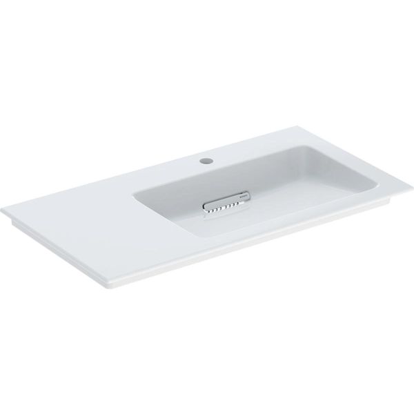 Möbeltvättställ med horisontellt utlopp. Avställningsyta vänster. B: 90cm, T: 48cm, Kranhål: Höger, Överfyllnad: Utan. Färg: KeraTect/vit , glansig vit
