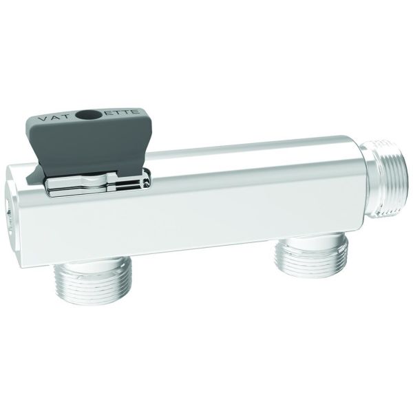 Väggfördelare för 2 rör, med avstängning, som ersätter fördelarskåp och ryms bakom en kommod. Fördelaren minimerar risk för vattenskador eftersom alla skarvar är utanför väggen. Kan anslutas till Vatette V6 kopplingsbrickor och Vatette V6 väggenomföringssytem.