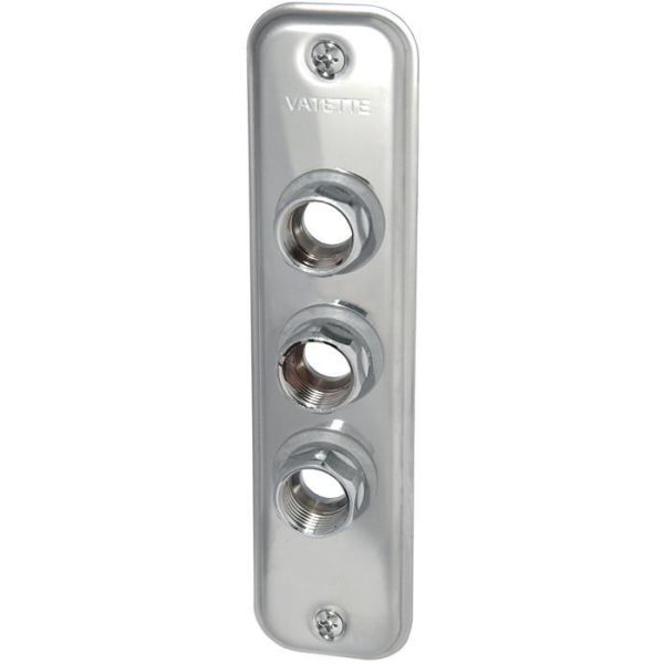 Vatette 8550627 är en 3-håls väggbricka för Ø 15 mm kopparrör. Brickan kan också användas med Ø 10 och 12 mm rör om den kompletteras med förminskning 15x10/15x12.
