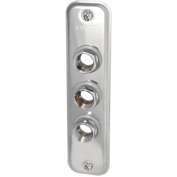 Vatette 8550646 är en 3-håls väggbricka med klämhylsor för Ø16x2,0-2,25 mm PEX- AluPEX- PE-RT- och PB-rör.