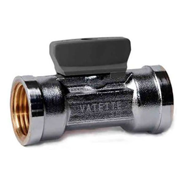 Vatette FG079503405 är en rak kulventil med invändig gänga och vred. Innanmätet består av en ihålig kula som stänger när den vrids 90 grader. Kulan tätar mot ett nylon eller gummisäte.