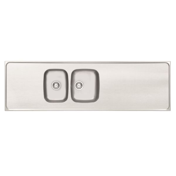 Heltäckande reversibel (vändbar) diskbänk med två contura lådor som passar i 80-skåp, tillverkad i förstklassig slät rostfri plåt med 12mm tjocka ljuddämpningsplattor under plandelen och fall i planet mot lådorna. Diskbänken levereras komplett med vattenlås och kranhålsförstärkning.