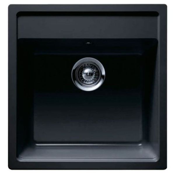 Diskbänk i granitmaterialet Cristalite med singellåda och plats för armatur i bakkanten. För nedfällning, under- eller planlimning. Levereras med vridventil. Vattenlås 1901229 eller 783120 beställs separat. Kranhål är förborrade för valfri placering av armatur och ev. tillbehör.