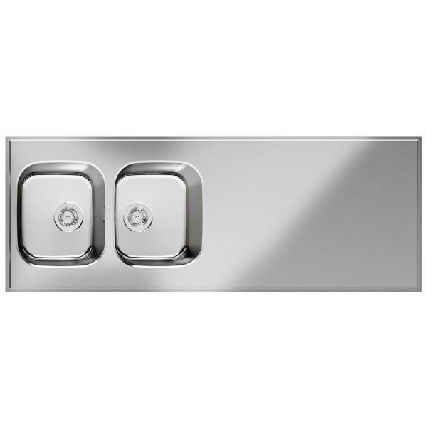 Diskbänk i 1,25 mm rostfritt stål. Levereras med diskho Iris 3434 med korgventil, placeras vid kant så modellen är vändbar. Underbyggd fukttrög spånskiva som är förberedd för kranhål Levereras komplett med vattenlås och korgventil..