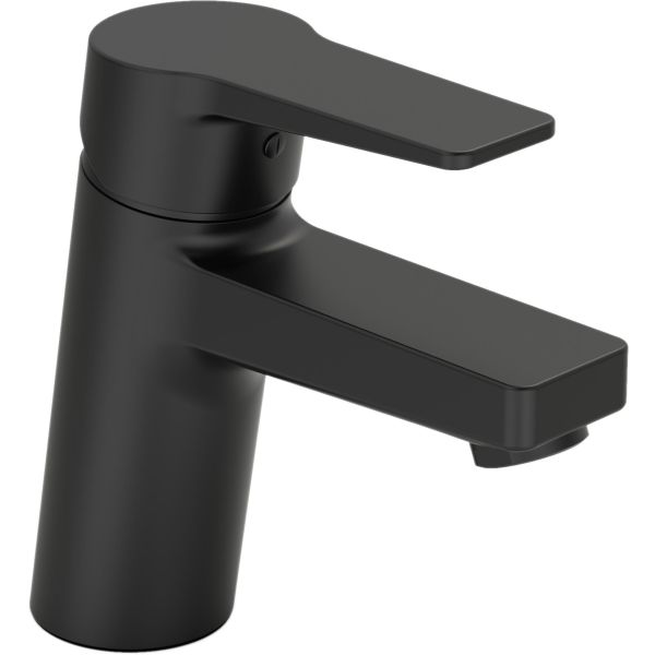 Svart tvättställsblandare med fast utloppspip och strålsamlare. Inbyggd spärr för begränsning av temperatur och flöde. Flödeskontroll 6.0 l/min. Flexibel anslutning. G3/8"" inv.g. Tillverkad i 4MS godkänd mässingslegering.