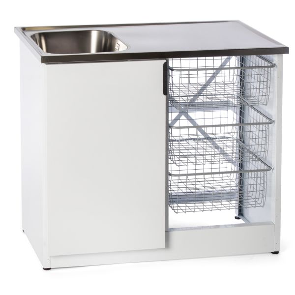 Nimo TB 1000 HT är en vit tvättbänk. Levereras halvöppen med en dörr. Tre stora trådbackar, tvättmedelsutrymme, barnspärr, dubbla förvaringsfack i dörren, med dörrdämpare, dolda gångjärn och helintegrerad sockel.