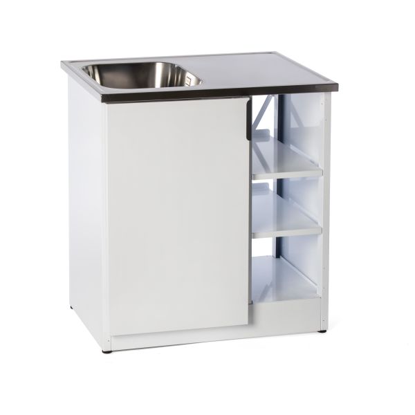 Nimo TB 800 HT är en tvättbänk, levereras halvöppen med en dörr. Tre hyllplan, tvättmedelsutrymme, barnspärr, dubbla förvaringsfack i dörren, med dörrdämpare, dolda gångjärn och helintegrerad sockel.