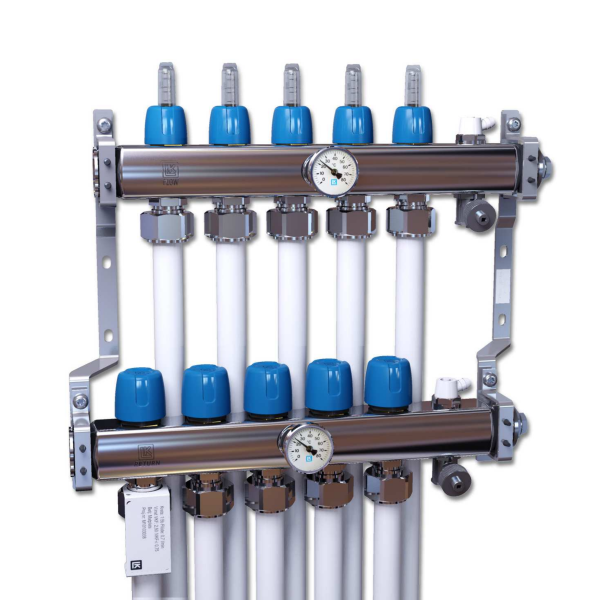 Golvvärmefördelare i rostfritt stål med integrerade injusteringsventiler, flödesindikatorer, termometrar samt avluftnings och påfyllnadsventiler.