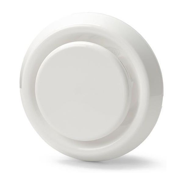 Frånluftsventil av vit plast, med fjäderbladsfastsättning.